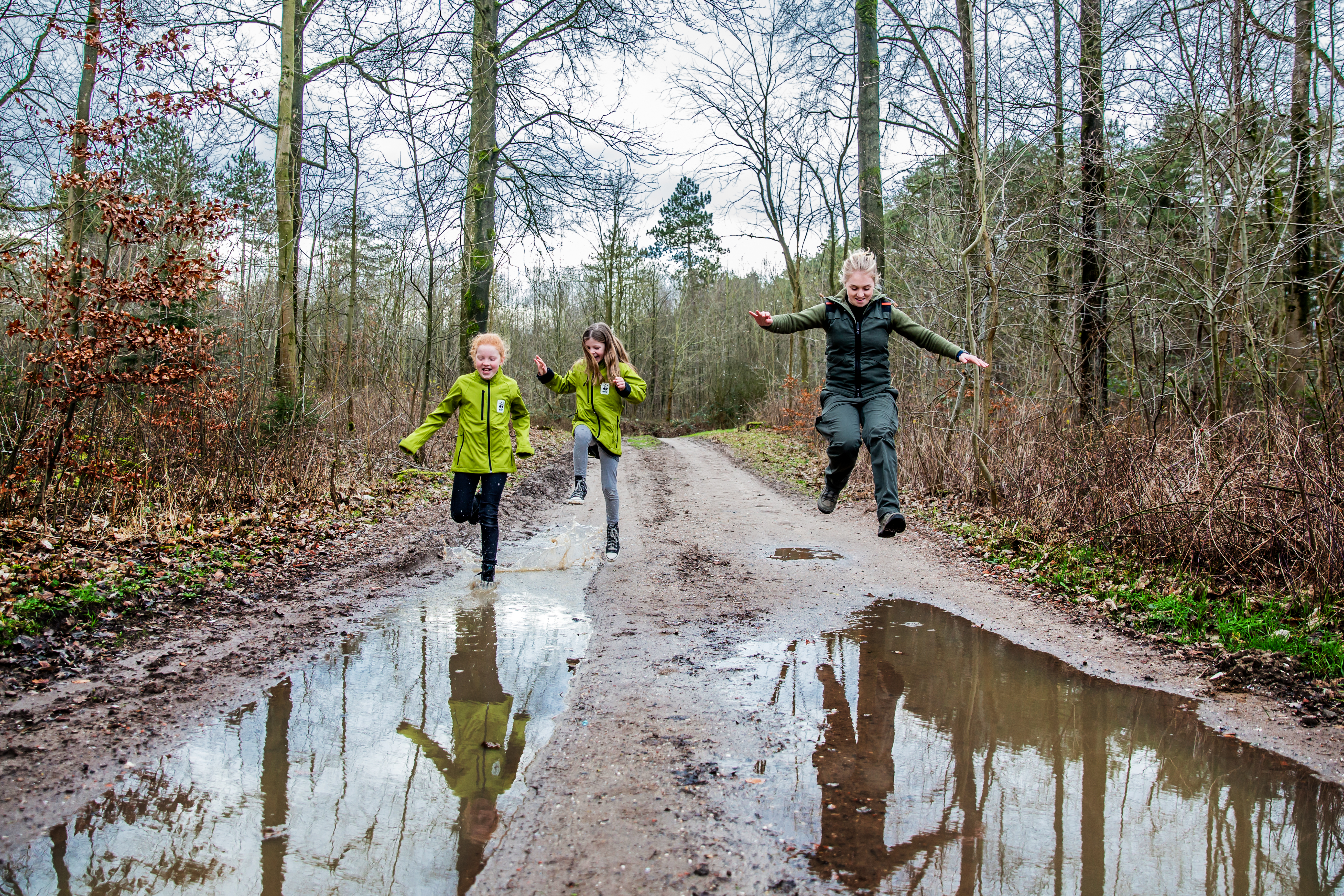 “Voordat we het bos in gaan, wil ik jullie één belangrijke regel uitleggen”, zegt Amy streng. “Als je een mooie plas ziet, moet je een aanloop nemen er erin springen.” Daar houden Annemijn en Isabel zich aan.